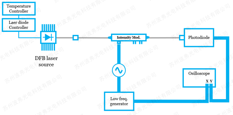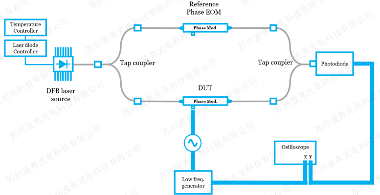 对于相位调制器测量VπRF,必须将相位的变化转变为强度的变化。这有很多方法:其一包括45度入射相位调制器波导(偏振波导APE工艺不适用,通常iXblue 1um及其以下波长调制器为偏振波导),建议一个干涉仪系统。其二可通过在一路光路中加入相位调制器,建议法布里-珀罗干涉仪。更多方法,请参考我们应用指南”相位调制器带宽测试”应用指南。