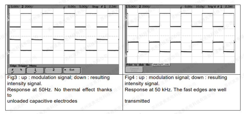 下面的图1和图2示出了当使用50Hz和50KHz方波调制信号时,使用高带宽相位调制器(MPZ-LN-20型,>20GHz电光带宽)。热效应的影响在图1中非常低频时清晰可见,在50kHz时热效应几乎消失
