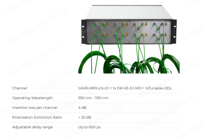 NIR-MPX-LN-0.1及其匹配放大器DR-VE-0.1-MO都是高功率相干光束合成应用的理想选择。NIR-MPX-LN-0.1也使用质子交换技术(APE)工艺生产。由此产生的偏振波导可以在光波导芯片的输出端产生大于60db的偏振消光比。APE工艺也有助于实现300MW的高光输入功率处理。该调制器还具有插入损耗小、光学稳定性高等特点。