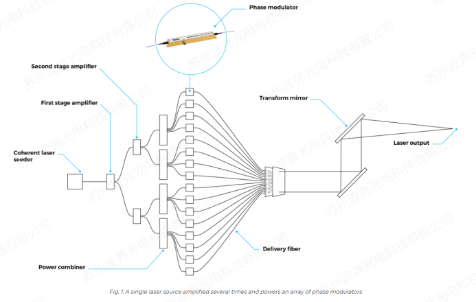 具有窄线宽(kHz量级)的单一激光器被多级光纤放大器放大几倍的功率,并馈送到相位调制器上(每个激光通道上放置一个相位调制器),对每个通道光束分别应用相位校正。调制器动态地校正光路的相位差,并保持输出激光束的空间和时间特性。换言之,通过实时控制多个激光器的相对相位来组合多个激光器,可以永久地保持干涉的最大化,从而保证合成期间的最大功率效率。