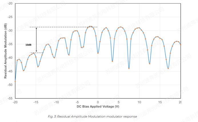 调制器也是直流耦合器件,这意味着您可以施加直流电压以最小化剩余振幅调制(RAM)效应(iXblue Photonics专利技术,US2016109734A1,“”Electro-optical phase modulator and modulation method”)。下图显示了施加直流电压时测量的RAM值。结果表明,通过简单地给调制器增加一个直流分量,就可以将剩余幅度调制减少10倍或更多。