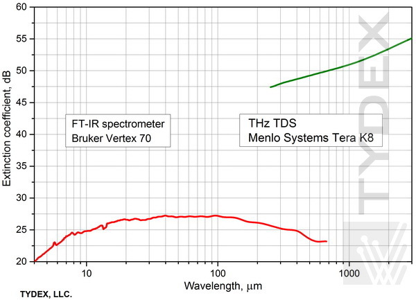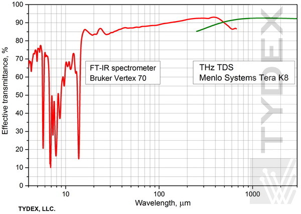 偏振器的透射光谱由两台仪器测量。 在 0.9 – 670 μm (333.1 – 0.45 THz) 的短波范围内,使用了 FT 光谱仪 Bruker VERTEX 70。 在 150 – 3000 μm (2 – 0.1 THz) 的长波范围内,我们使用了带有 600 μm 偶极天线 (fc=0.5 THz) 的 Menlo Systems TERA-K8 太赫兹时域光谱仪。