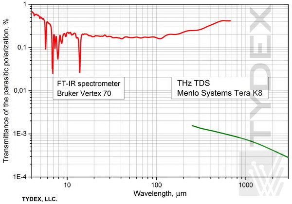 上面的曲线清楚地表明我们的偏振器在非常宽的波长范围内具有出色的质量。 请注意,实际测量结果可能与上面给出的值不同,具体取决于光谱仪类型和测量模式。