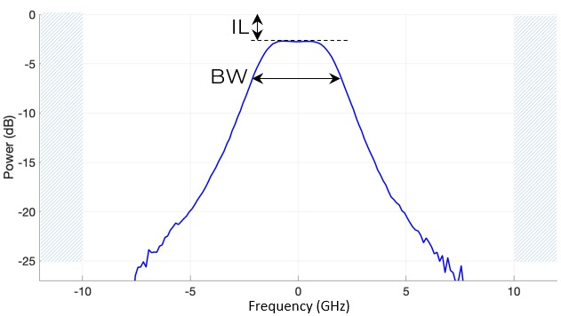 典型响应(IN ➙ OUT):允许传输特定窄带,抑制C或L波段中其他波长。提供从1 -4 GHz多个带宽选择 |